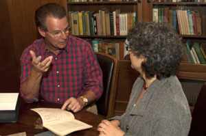 SMU parent Steve Weeks talks with English Professor Beth Newman about the Pickwick Papers. |