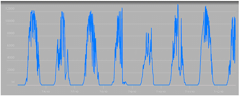 Graphics on the site allow the user to compare highs and lows in energy production across the days and months since the array was installed in November 2009. Some of what has been recorded so far can be surprising to the layman: For example, the peak energy production period so far was during bright, cool days in April – not during the recent, triple-digit days of summer. The poor air quality that is more prevalent in summer and high temperatures that affect the reflection surface actually reduce the amount of energy the panels can produce.