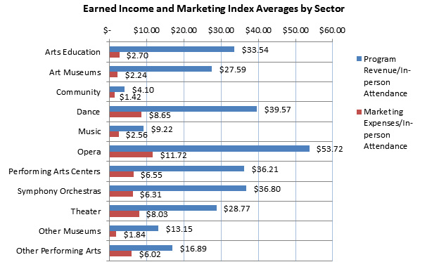 - Arts and cultural organizations earned an average of $22.26 per person who participated in the organization’s program offerings, with a wide spectrum when broken down by sector: from a low of $4.10 for community organizations to a high of $53.72 for opera companies, reflecting the differences in operating models.