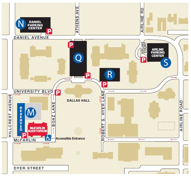 Preferred parking lots are Daniel Parking Center (N), Lot Q, Lot R, and Airline Parking Center (S).
