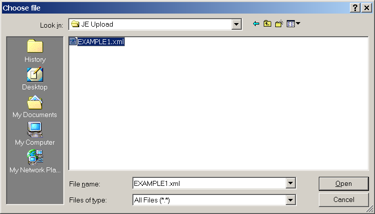 13. For File Name enter the following ...C:\JE Upload\(filename).xml . . . where (filename) represents the file name you assign the upload file to be created. We recommend you give it the same name as your Journal Sheet name, but that is not a requirement.