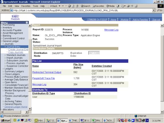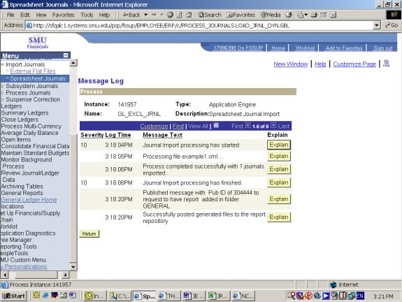 28. Review the message log. It will tell you whether the file was successfully imported or not. The following two screens display different results - the first was a successful import, the second was not. The key is if the number of journals imported equals 0 (failure) or 1 (success.)