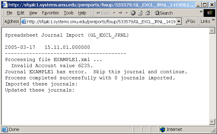 31. A separate browser window launches with a reason for the failed import. In this example, it was because an invalid Account number was used. To correct these errors, you must return to the JE Upload Tool (step 10 above), correct the data in error and then recreate the file for upload. In other words, repeat the process beginning at Step 10.