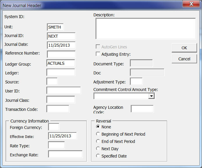 Begin by entering Header information for the journal. Click the yellow "+" button to add a Header.