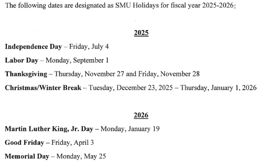 The SMU Police Department is the repository of all records related to law enforcement activities and is responsible for responding to all open records requests. The SMUPD Public Information Office is open Monday- Friday, 9:00 a.m. to 5:00 p.m.,with the exception of the holidays listed below. The office will also be closed during any closure of the campus due to weather or other emergencies.