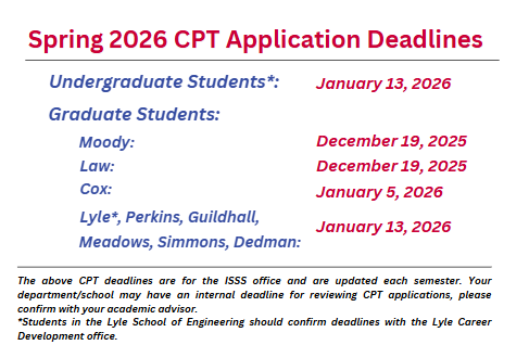 Click here to view the SMU Academic Calendar. - Meadows performance students can submit a CPT Application throughout the semester as long as they are enrolled in a performance course that requires practical experience.