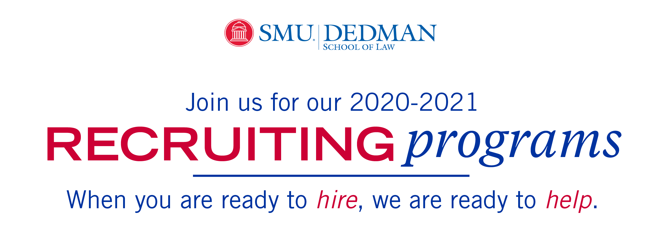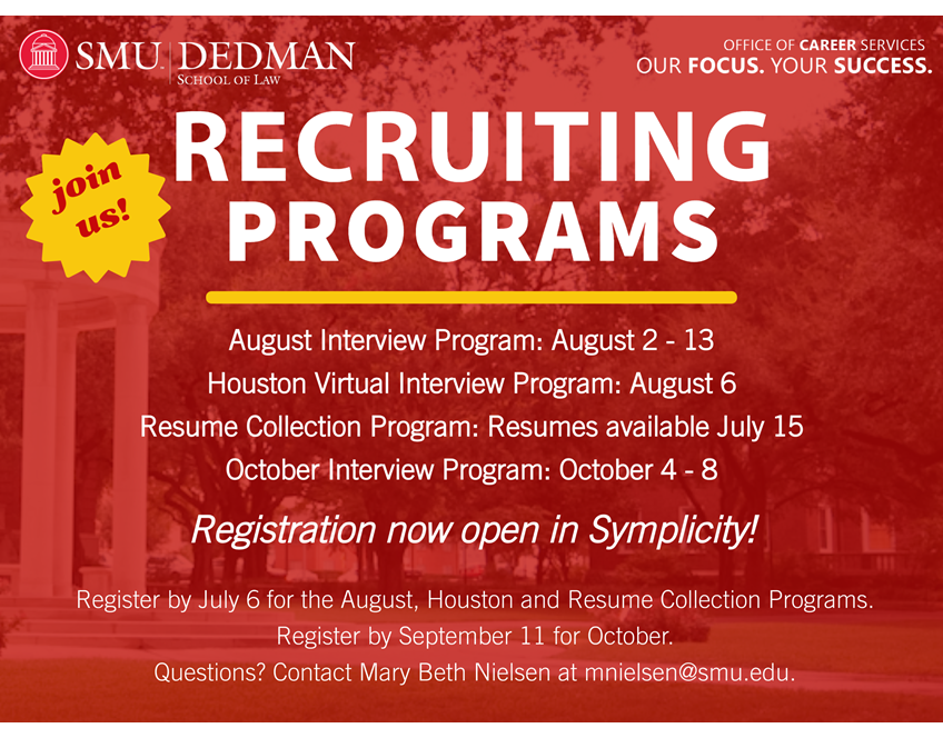 SMU Dedman Law invites all employers to recruit anytime during the school year, and our office is prepared to assist you with posting your positions, collecting and forwarding resumes, and setting up virtual or in-person interviews.
