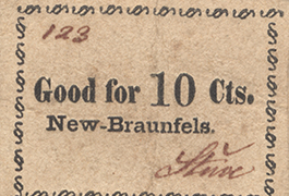 The record for each currency note captures the note’s important features. They are searchable by decade, county of origin, town of issue, bank issuer, and denomination, as well as by individual keywords. The bank notes are assigned a rarity number ranked from 1 (least rare) to 7 (rarest). The rarity of a note is indicated by the letter “R” and the corresponding rarity number, for example, R.5. There are occasional references to Medlar or Bieciuk and Corbin (BC), authors respectively of "Texas Obsolete Notes and Scrip" and "Texas Confederate County Notes and Private Scrip." Reference to these resources is indicated in the Notes field by either “Medlar” and a page number or “BC” and a page number.