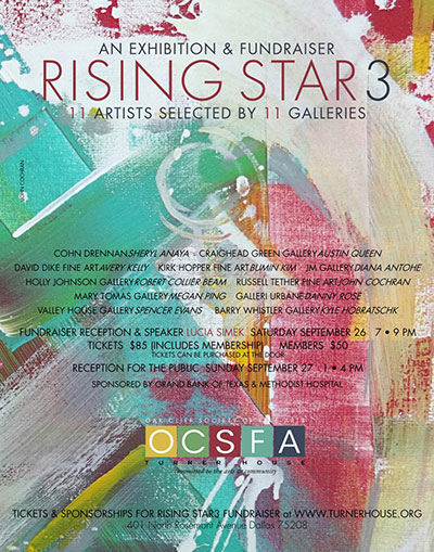 Turner House (the Oak Cliff Society of Fine Arts) will debut its third “Rising Star” exhibition and fundraiser September 26th and 27th at the historic Oak Cliff home. Eleven prestigious Dallas galleries have each nominated one emerging Texas artist to be in the group show.
