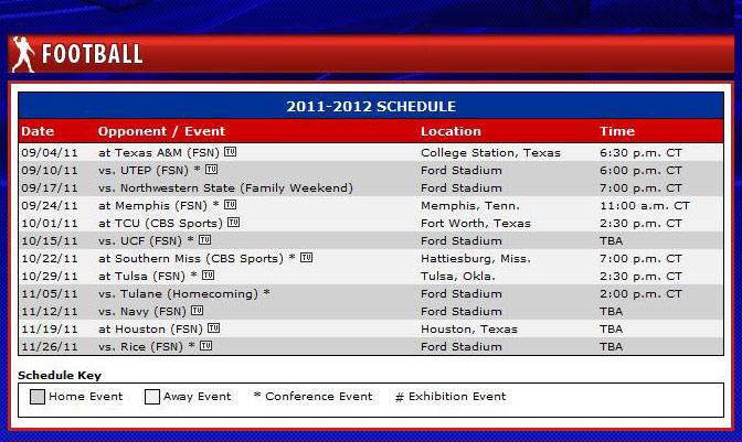 The Mustangs will then enter a tough stretch with four of five games on the road, playing at Memphis (Sept. 24), at TCU (Oct. 1), at Southern Miss (Oct. 22) and at Tulsa (Oct. 29), with only an Oct. 15th home rematch of the 2010 Conference USA Championship Game against UCF breaking up the road run.