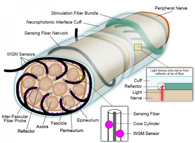 A fiber-optic prosthetic for a human patient would likely be a cuff — loaded with optical cables — affixed at one end to a prosthetic, and attached at the other to the body’s severed nerves. Those are a decade off, but already, researchers say they’ve nearly climbed the project’s biggest hurdle: Developing sensors with enough sensitivity to detect — and trigger — the infinitesimally small perturbations of a single activated nerve.