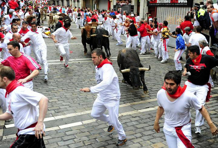 Mickey Saloma of SMU's Lyle Engineering School runs with the bulls in Pamplona, Spain, in early July 2011.