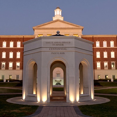 The Gail O. and R. Gerald Turner Centennial Pavilion with the Cooper Centennial Fountain and the R. Gerald Turner Quadrangle in the background. |