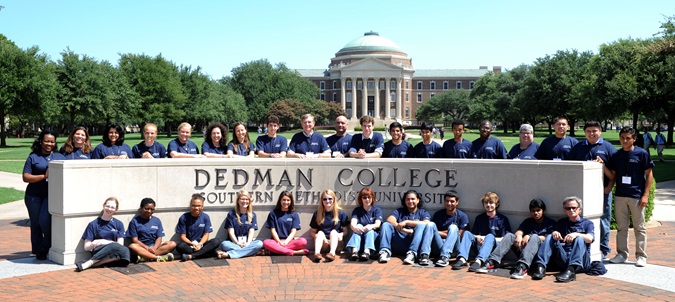 Townview students with SMU faculty and IBM staff in front of Dallas Hall.