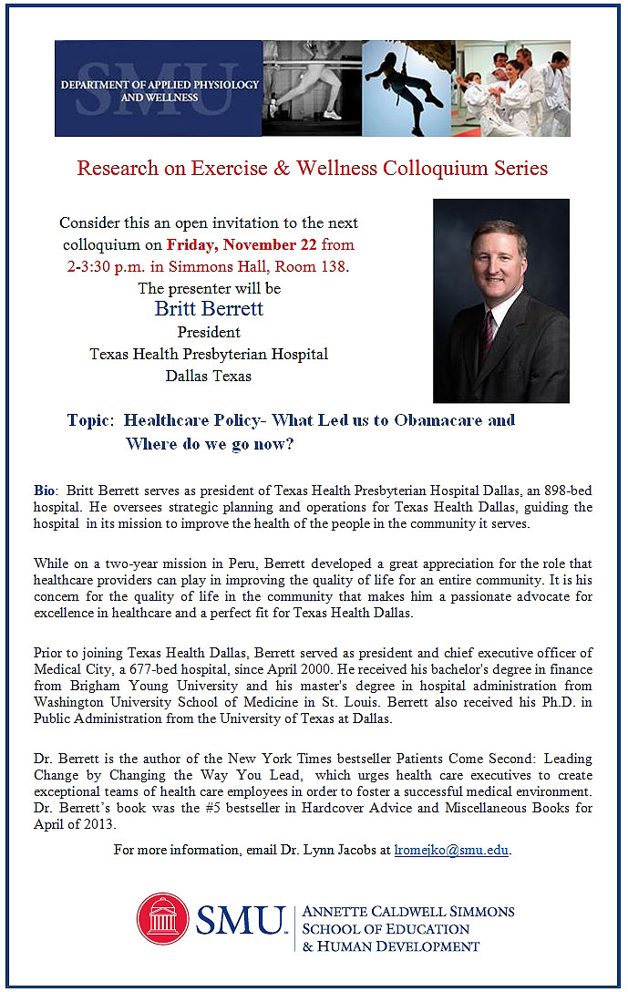Britt Berrett, president of Texas Health Presbyterian Hospital Dallas, will speak about "Healthcare Policy - What led us to Obamacare and where do we go now?" at SMU on Nov. 22.