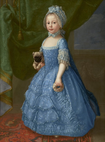 “The details in this painting are exquisite, reflecting Bayeu’s tremendous skill,” said Nicole Atzbach, curator at the Meadows Museum. “For example, María Teresa del Castillo wears a robe à la française, characterized by a funnel-shaped or conical bodice that then becomes voluminous rectangular skirts conceived in a deep blue silk. The back of the sitter’s dress features the floor- length pleats of the sack gown, the late 17th-century dress from which the robe à la française is derived. María Teresa’s dress also features a square-cut neckline which, when worn by adult women, would provide ample space to display strands of pearls or a velvet bow. In this case, Bayeu has jettisoned such adult adornments and instead outfitted his young subject with more age-appropriate trappings, including a glazed rosquilla (a donut-shaped pastry) in her left hand and a small dog tucked securely under her right arm. The combination of the sophisticated fashion and the child-friendly touches make this painting both beautiful and charming.”
