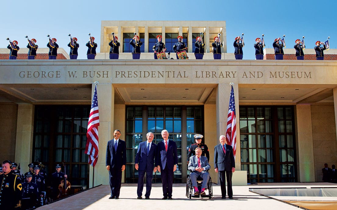 A historic moment: The dedication of the George W. Bush Presidential Center on April 25, 2013, at SMU brought together five presidents of the United States (from left): Barack Obama, George W. Bush, Bill Clinton, George H.W. Bush and Jimmy Carter.
