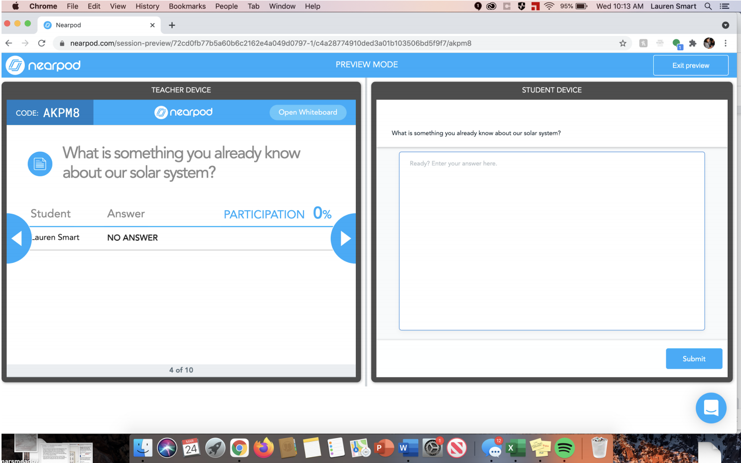 Nearpod is a tool that allows you to easily build slideshows that include real-time engagement for the students. It has several built in features, like real-time questions to which students can submit answers, a whiteboard feature and an exit quiz. It’s important to note that this tool was originally designed for K-12 classrooms, so it can feel childish or rudimentary. But for those of us who don’t require videos on during Zoom classrooms, or want to make sure students are still paying attention, it’s a quick, easy way to present a slideshow, while also monitoring digital presence.