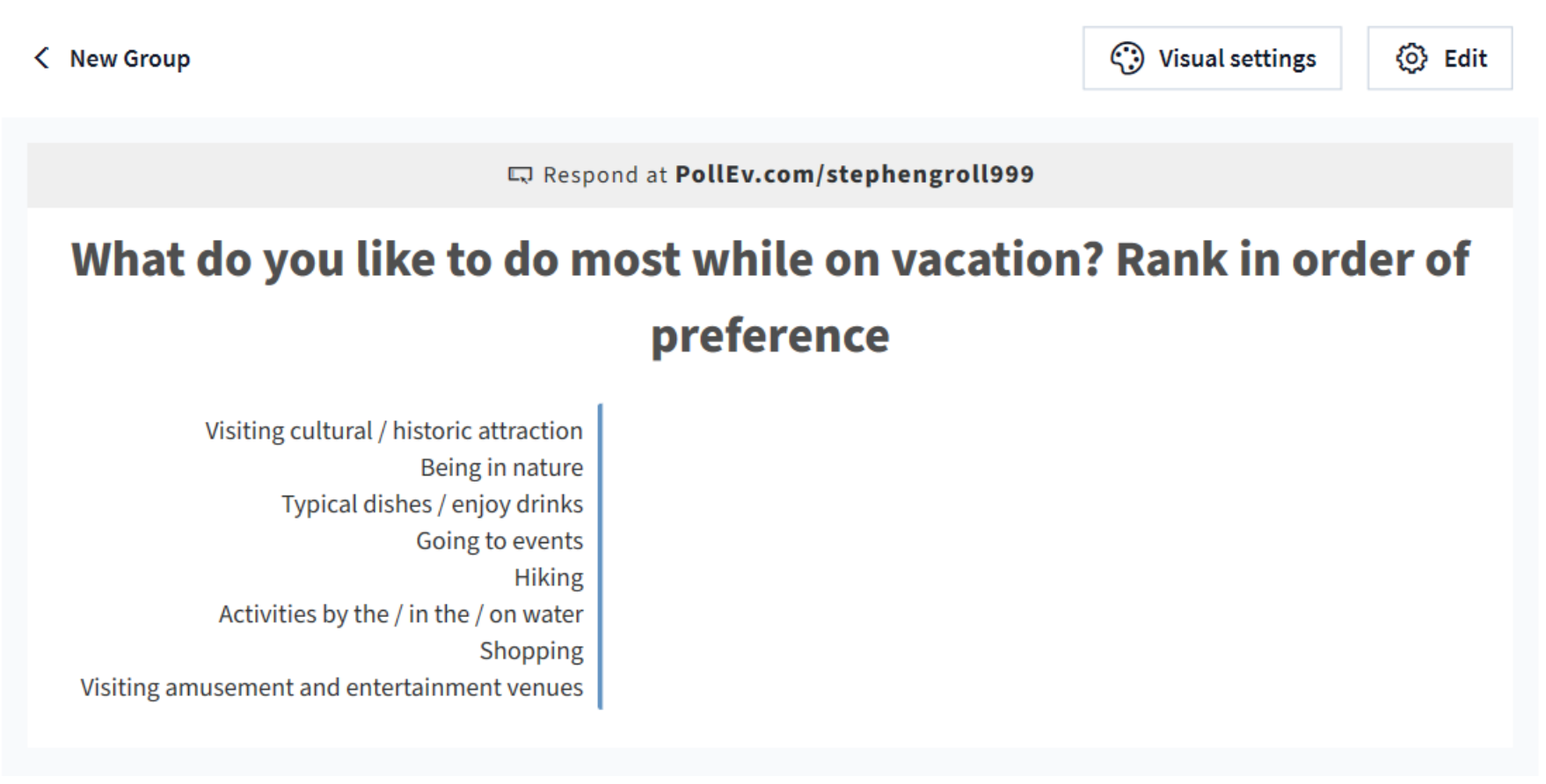 Background and context: I use this type of polling in my German classes as a way to prepare them for interpreting statistical data on German society and culture. The idea is to survey the class about a topic and then see how Germans respond to the same question. In this case, the question was about preferred vacation activities as part of a chapter on travel and leisure. Students take the survey, then compare and contrast their results to those of the German respondents.