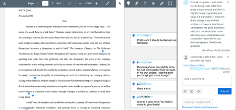 Guidelines for peer review can be tricky, but students will do a good job for each other with a little direction. I have found the Canvas peer review option to work really well, both asynchronously and working together in class. The students submit rough drafts the evening before and complete two reviews by the end of the period or the end of the day, depending. Here I have attached a screen shot of a typical submission. Students can and do also use the audio comment feature in the Speedgrader.