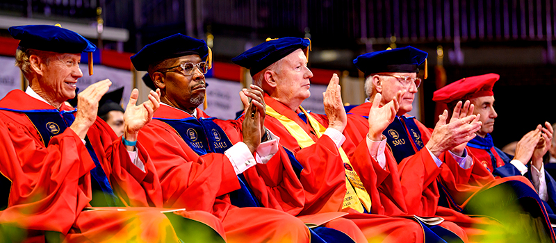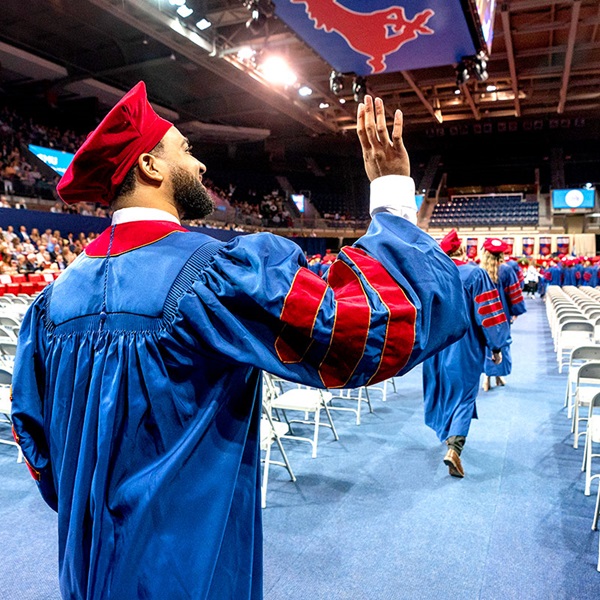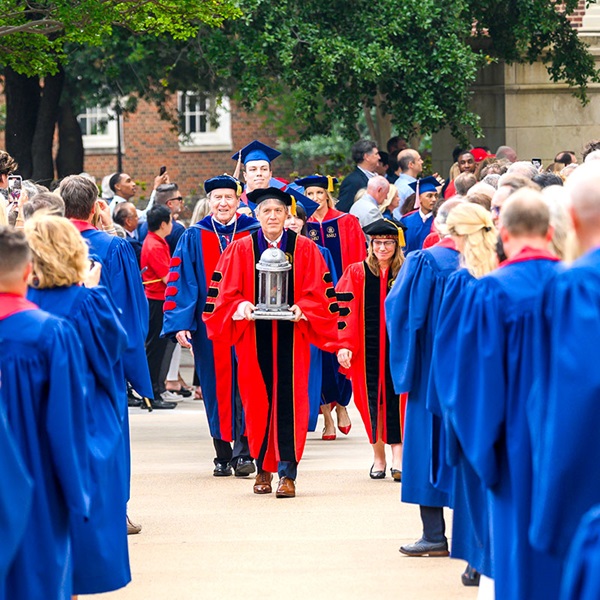 Faculty will assemble in academic dress no later than 8:45 a.m. in Miller Champions Club. The faculty process to the floor of Moody Coliseum, led by the retired faculty. Faculty procession begins moving at approximately 9:10 a.m. following the graduation candidates, who take the floor at 9 a.m. Faculty remain standing until the president is seated. With respect to the removal or replacement of mortarboards, follow the lead of President Turner. After the playing of the University hymn, “Varsity,” the Platform Party leads the recessional, followed by the faculty in a single-file line.