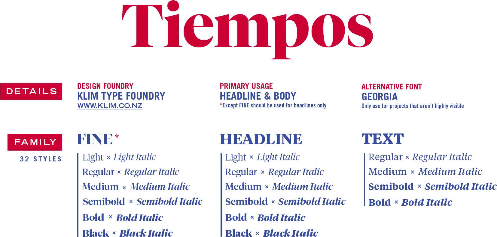Trade Gothic makes a statement. Tiempos adds verve. These creative types harmonize beautifully, so feel free to play around and find the perfect balance.