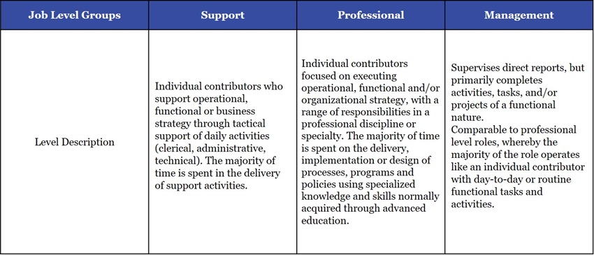 A. Staff positions are organized into three categories: Support, Professional and Management.