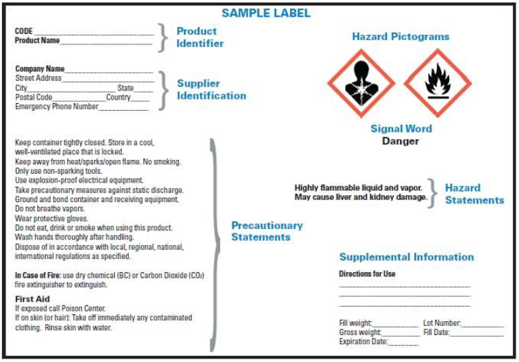 The Globally Harmonized System for Chemical Classification (GHS) system has been implemented since June 2015. This classification system enables hazardous chemical labels to be recognize internationally. All hazardous chemical containers require GHS labels. GHS Labels must include the following information: product identifier, supplier’s contact information, chemical hazard classification (pictogram), signal word, hazard and precautionary statements and supplemental information. The label must be written in English and clearly visible on the hazardous chemical containers.