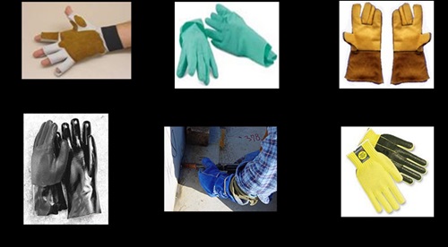 There are many types of gloves that can protect someone from cuts, punctures, burns, and chemical exposures. It is important to know what protection level the gloves are rated for and what are the potential exposure levels.