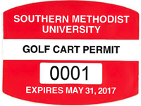 All SMU-owned, long-term-leased (greater than six weeks), and contractor-owned SCUVs or LSV/NEVs must added in STABLE under Fleet Vehicle Management. The Office of Risk Management will then register your SCUV or LSV/NEV and issue a registration label (see example below). Labels may be picked up from the Office of Risk Management, 6300 North Central Expressway. This label is to be mounted on the inner front side of the passenger side windshield.