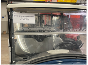 Short term leases or rentals (1-41 days), shall have the below (or similar) affixed in an easily seen location on the front of the vehicle, preferably in the upper left hand corner of the windshield while providing an unobstructed view. The tag must identify the department, responsible party, and a contact number.