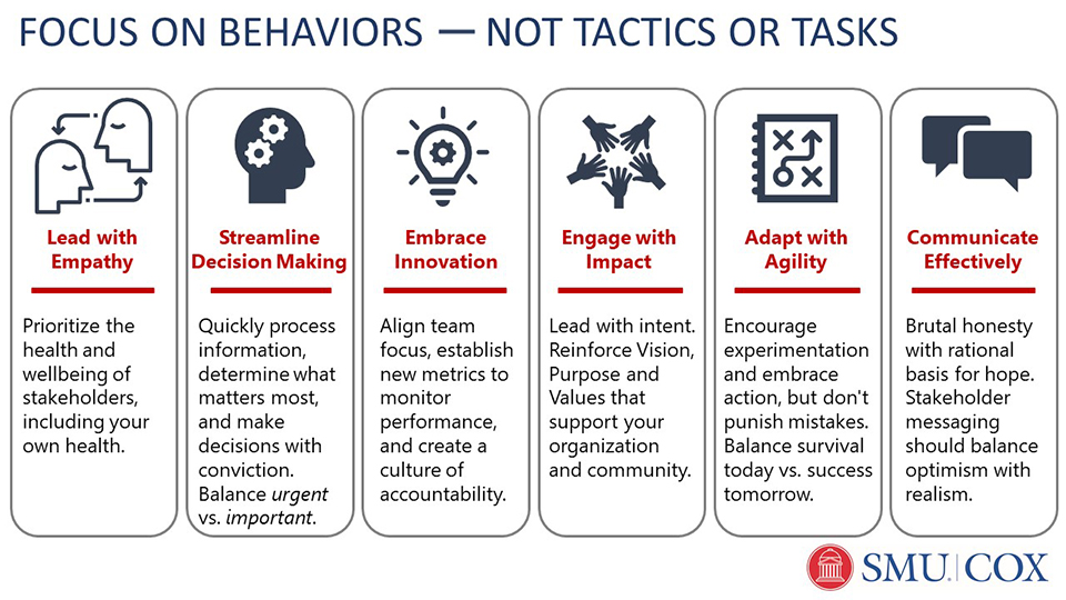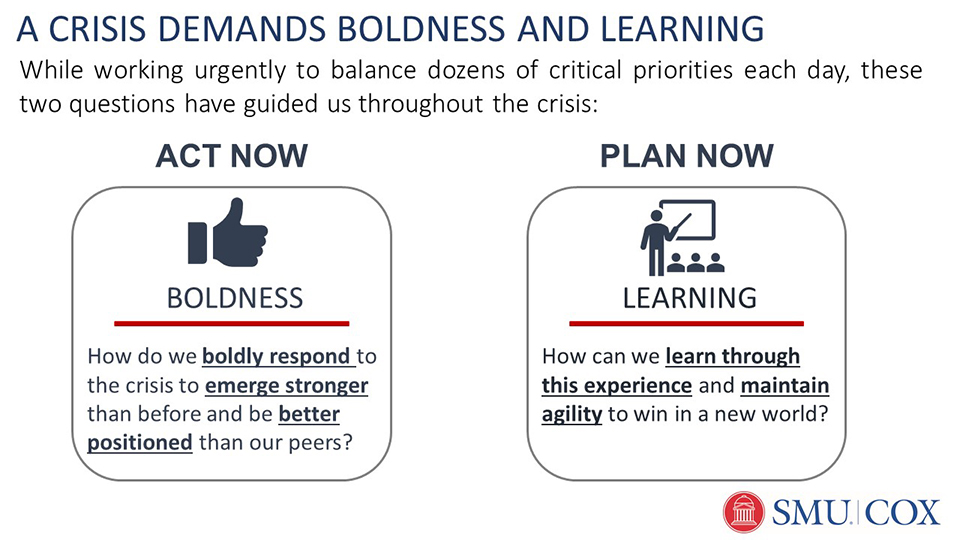 On February 20, 2020, we at the Cox School of Business celebrated our 100th year of business education at Southern Methodist University. Three weeks later, we announced that our campus was closing, and all our undergraduate and graduate programs were transitioned online for the remainder of the academic term, due to the Coronavirus (“COVID-19”) pandemic. The scale and scope of the pandemic is almost inconceivable, and the roles and responsibilities of leaders have dramatically changed in the past month. Before COVID-19, we were working on our “Next Generation” Strategic Plan which focused on enhancing our scholarly research, fostering innovation, offering new and updated degree and non-degree programs, increasing profitability and gaining market share. Today, we need to be agile as we encounter unforeseen obstacles — student learning outcomes in the virtual classroom, staff and faculty shortages, and other operational challenges — that drastically alter the scope of our roles and priorities. All the while, our teams are navigating health and safety concerns, working remotely, and supporting their families through the pandemic.
