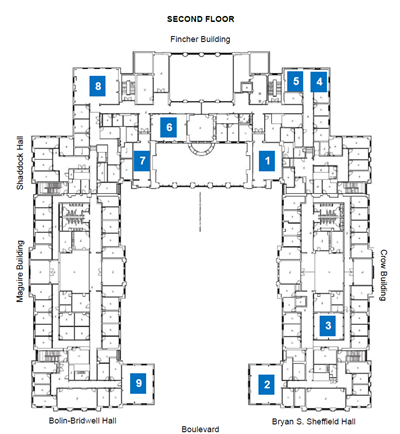 Centrally located on the second floor and designed to maximize opportunities for faculty discourse and collaboration with conference rooms, seminar rooms and areas dedicated to student engagement. Read about the stopping points on the Open House tour below.