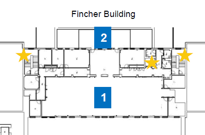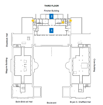 The Third Floor can only be accessed by elevators located to the right of the Fincher building or via stairwells on the right and left sides of the building.