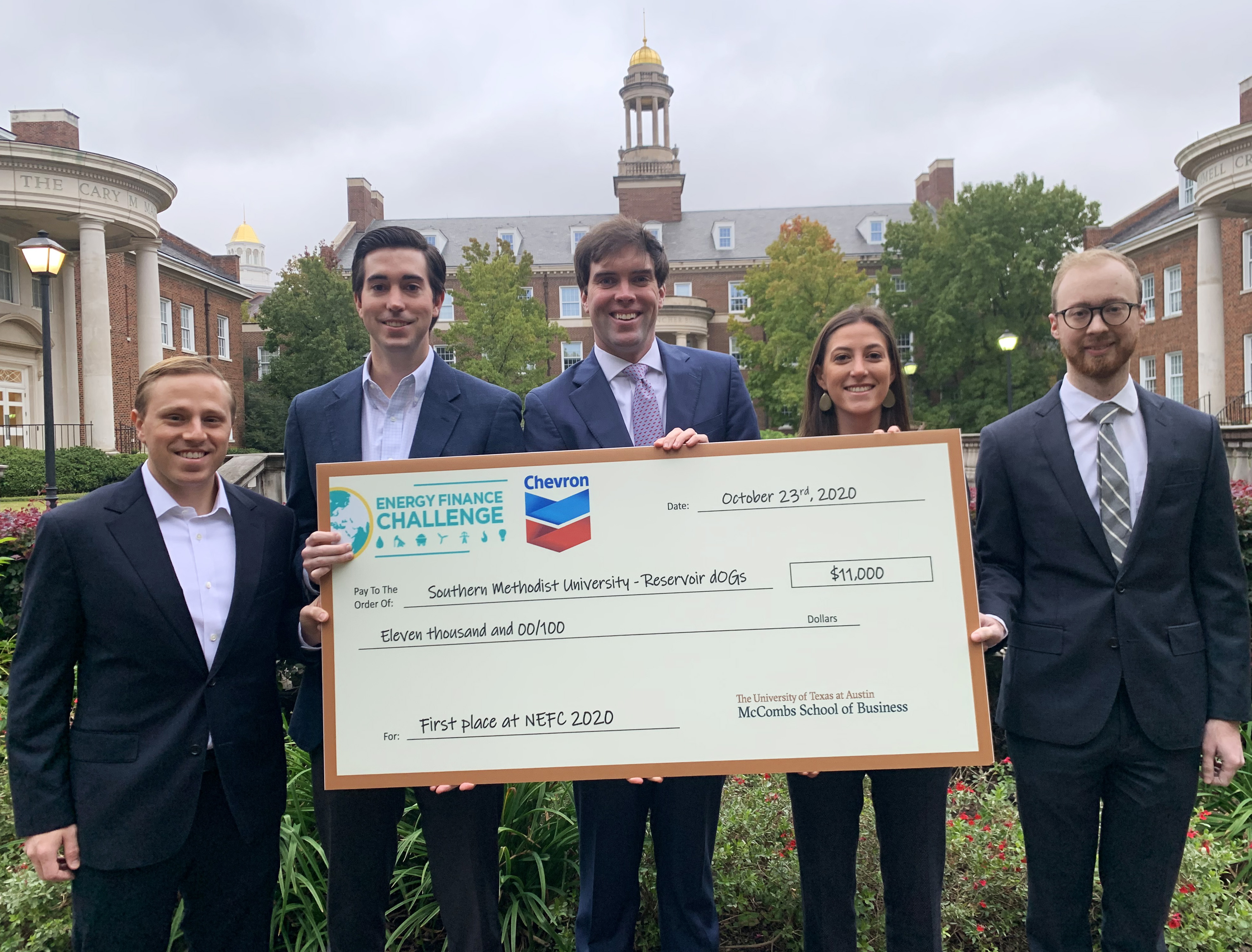 A team of two second years and three first year SMU Cox MBA students representing the MBA Energy Club claimed first place and an $11,000 top prize at this year’s National Energy Finance Challenge (NEFC) hosted by the University of Texas’ McCombs School of Business. The Cox Energy MBA student representatives, calling themselves "Reservoir dOGS," bested their national counterparts, including Ivy League competitors and fellow Texas business school participants. This year's case competition took place virtually the week of October 19 and culminated on Friday, October 23. The Cox Reservoir dOGS team consisted of Emily Mallon and Morgan Mitchell, both MBA Class of ’21, and James Avondet, Ethan Burgh and Hayden Brown, all MBA Class of ’22. Together, they beat Michigan and Rice to advance out of the first round and topped Dartmouth, Duke and Northwestern during the final round.