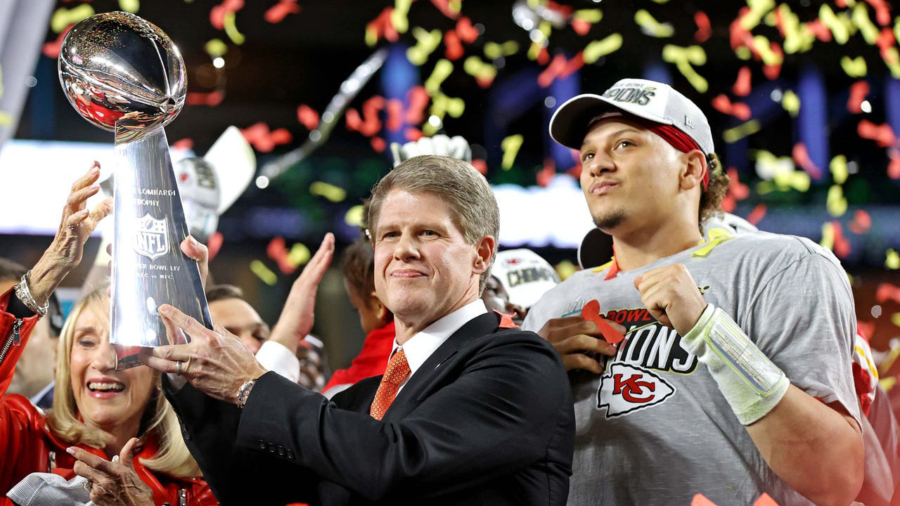 Cox News Kansas City Chiefs CEO Clark Hunt receives the Lombardi Trophy from NFL commissioner Roger Goodell after his team's win in Super Bowl LIV.