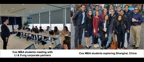 In 2019, Cox MBA students traveled to Shanghai to work with corporate partner Li & Fung, a $2 billion dollar company with over 1,100 employees around the world. Cox MBAs gained exposure to global business practices, applied methodologies to solving real supply chain business problems, and delivered actionable recommendations for retailers such as: Walmart, Sam’s Club, Costco, Home Depot, Ross, Kroger, Action, Officeworks, Dunelm, John Lewis, Michaels, and Jo-Ann Stores. Students developed their ability to solve complex problems, hone communication and presentation skills, and gain insight and leadership perspective on global business.
