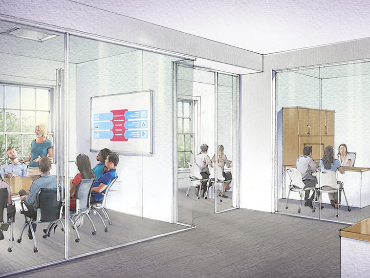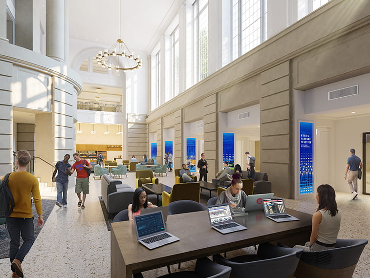 Dynamic, upgraded academic spaces including traditional lecture halls, cluster-style classrooms and hybrid-model classrooms that enhance the educational experience through revolutionary technology, project-based learning, modern pedagogy and collaborative research.