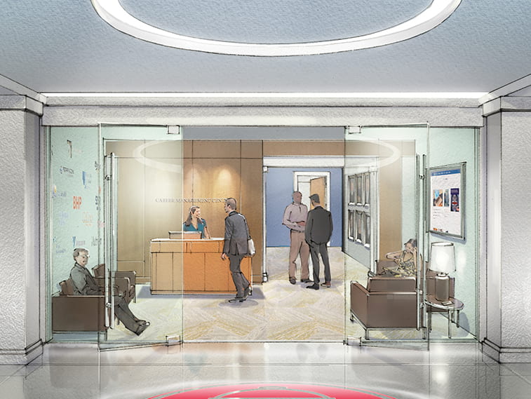 An expansive, centrally located, 6,600-square-foot center dedicated to the development and career advancement of Cox School students, offering a kitchen, multiple changing rooms for job interviews and 12 dedicated meeting rooms for interviews with corporate partners, company information sessions, career coaching, resume-building assistance, career workshops and cultivated networking events.