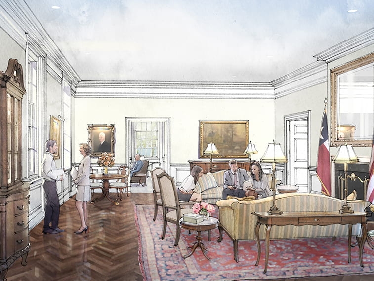 In support of this vision, current renovation plans include more space to facilitate the Cox School’s approach of engaged learning, which brings students and companies together to work on real-world, real-time projects, and total facility upgrades aimed at promoting interdisciplinary and collaborative learning. “That’s such a big piece today of higher education that the new project will facilitate that type of interaction and collaboration,” Myers says. That means Cox students will have opportunities to interact with Lyle Engineering students, Meadows School of the Arts students and so on.