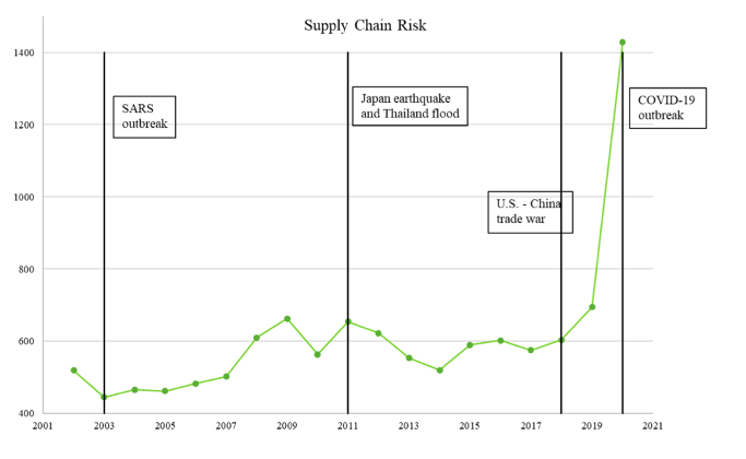 Supply chain risk appears to be heightened and sentiment becomes more negative in connection to events that are disruptive to global supply chains, such as the 2011 great East Japan earthquake and the Thailand floods, the Sino-American trade war, and more recently with the Covid-19 outbreak. Surprisingly, the 2003 SARS outbreak did not move the needle much. But that was also a time of less social media intensity.