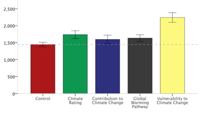 The rating labeled “Vulnerability to Climate Change” delivered by far the greatest spike in climate-conscious investment, leading participants to invest, on average, $2,243 in the company with the most favorable climate rating. This finding confirms that investors care deeply about the climate risk exposure of their potential investment targets. The average additional investment in the most climate-friendly stock is $799 for the Vulnerability condition and $292 for the Climate Rating condition, out of $5,000 invested.