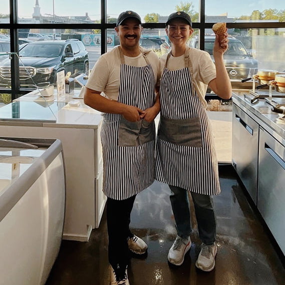Kellie Conant Stoll, BBA, and Brandon Stoll, Dedman ’16, were married in October 2021. While planning the wedding and getting ready to open a business in Dallas, they found out Brandon would have to go through open-heart surgery. In April of this year, after the surgery, recovery and getting married, they opened their first brick-and-mortar ice cream shop. Parlor’s Ice Creams started as a scoop cart back in 2019 at the Dallas Farmers Market but got big enough to become a real scoop shop. Located in Lakewood off Mockingbird and Abrams in the Hillside Village Shopping Center, they scoop locally sourced, completely from- scratch ice cream that tastes the way ice cream used to taste back in the day.