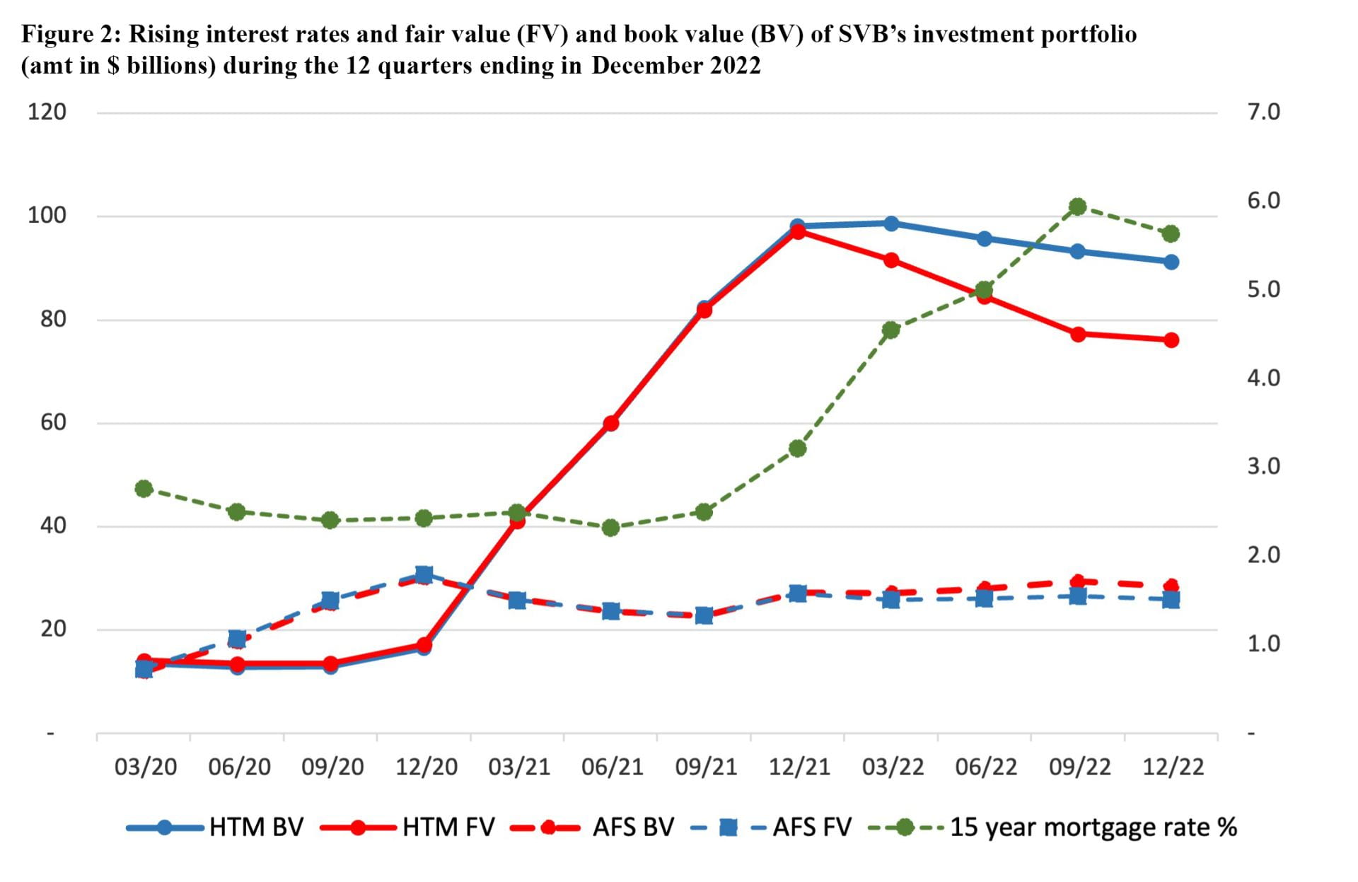 To be fair, it is not unusual for banks to invest their cash in treasuries or other highly rated securities such as Mortgage-backed Securities (MBS) issued by the Government Sponsored Entities (GSEs), as these securities are safe and liquid and offer a modest return. However, it is unusual for banks to hold almost half of their assets in investments, especially in the HTM portfolio. SVB’s ratio of HTM securities to Total Assets was 44% at the end of 2022 (see Table 1) and was by far the highest among its peers. Furthermore, out of the $91 billion investment in HTM securities, $86 billion was invested in MBS securities with a maturity of greater than ten years (reported clearly in its 10-K). In other words, SVB took on a huge duration risk. Not surprisingly, when the Federal Reserve increased interest rates (resulting in a corresponding increase in mortgage rates), the value of these securities went down significantly, as shown in Figure 2 below.