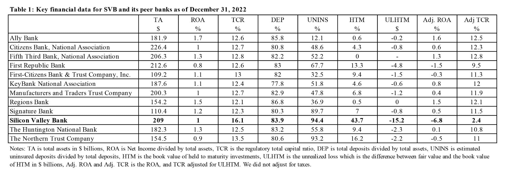 Let’s now examine SVB’s actions using the above framework and compare them to its peer group (publicly listed commercial bank or its bank holding company with total assets between $100 billion and $250 billion as of December 31, 2022). See Table 1 for some key statistics of SVB and its peers.