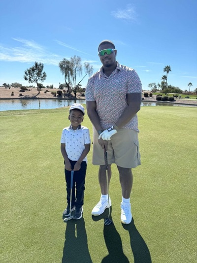 NFL lineman Kelvin Beachum '10, '12 on the golf course with his young son.