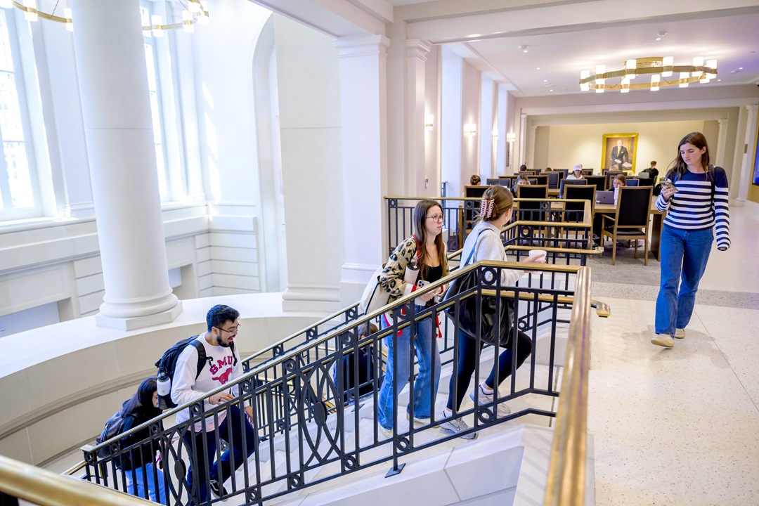 The Truman and Anita Arnold Commons, in the interior of the David B. Miller Business Quadrangle, features a stately staircase.