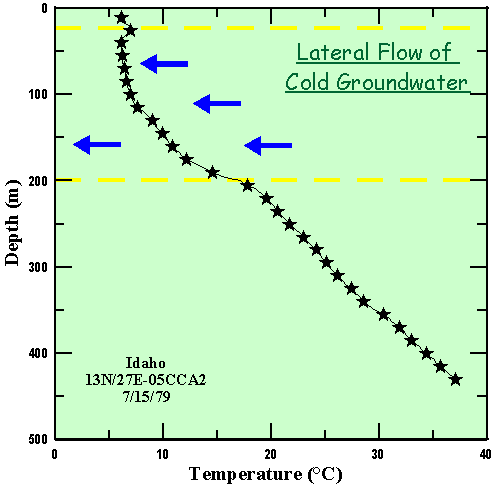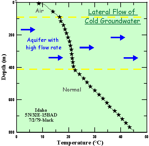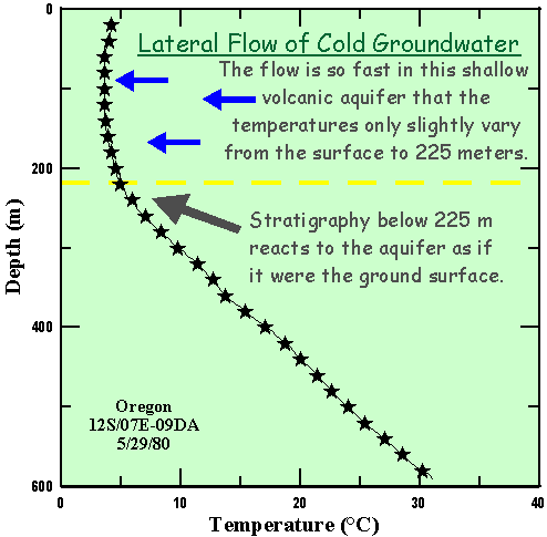 In many shallow volcanic aquifers groundwater flow is so fast that the temperatures through the aquifer have little to no change in temperature from the top of the aquifer to the bottom. In this scenario the temperature curve through the aquifer is a vertical line. The rocks below the aquifer seem to treat it as if it were the ground surface. The water temperature tends to be very cold in these regions, allowing the denser water to sink and not thus temperatures do not warm with depth.