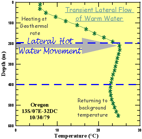 Transient lateral flow is very common in geothermal systems. Areas where there have been recent faulting are the most likely to find the transient flow. The term transient is used here on a geologic time-table. The length of time the flow will occur is dependent on the source of fluids and their chemistry. Faults will seal over time from crystallization of the minerals in the water precipitating out. The unusually hot water flows convectively up the fault until it reaches an aquifer or the water table. Where the fault and aquifer intercept is where the flow will become lateral. The heated fluid flowing laterally can be very deceiving when determining the size of a geothermal area. Many a driller has thought that they hit the geothermal jackpot only to keep drilling and watch the temperatures decrease with depth once through the lateral flow. These temperature-depth curves do contain information on the duration of flow, velocity, distance to recharge point and temperature of recharge.