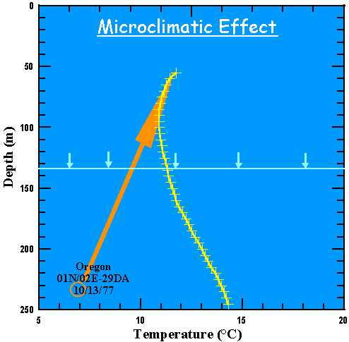 Variations in the nature of the ground cover and slope angle and azimuth within 50-200 meters of a borehole (well) collar can cause variations in gradient in the upper part of the hole. Some examples that cause surface temperature changes are the Earth's average air temperature warming, woods being clear-cut or growing, and pavement laid around a well. Most often the effect is to change the gradients no more than 20- 30°C/km at 20-50 meters depth, and only less than 5°C/km at 100-150 meters depth. The effects are rarely larger than this. The extrapolated surface temperatures from deeper than 150 meters is usually within 2°C of actual surface temperatures.